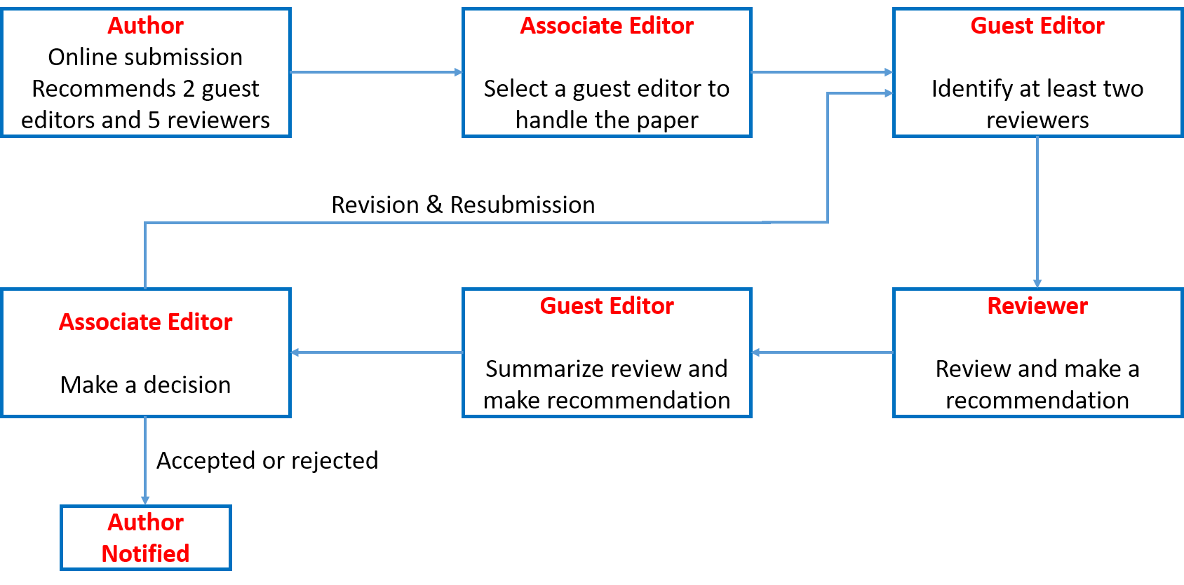 We are committed to peer-review integrity and upholding the highest standards of review. We firmly believe the authors know best about their research and who can evaluate their research. Therefore, Journal of Behavioral Data Science adopts an open review process. We allow an author to recommend two potential guest editors and five potential reviewers who are familiar with the topic of their paper. An associate editor will make the final decision on selecting a guest editor, and the guest editor will then select at least two reviewers. The guest editor makes a recommendation on acceptance, revision & resubmission, or rejection of the manuscript based on the reviews. The associate editor finally approves and concludes the review process. A manuscript is either declined or accepted after that. The review process is illustrated in the flowchart below.